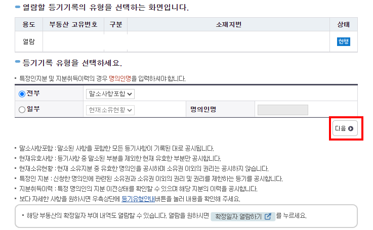 전부 및 일부를 선택이 가능하며 말소사항을 포함할지 여부 등을 선택한 후 다음 버튼을 클릭합니다.